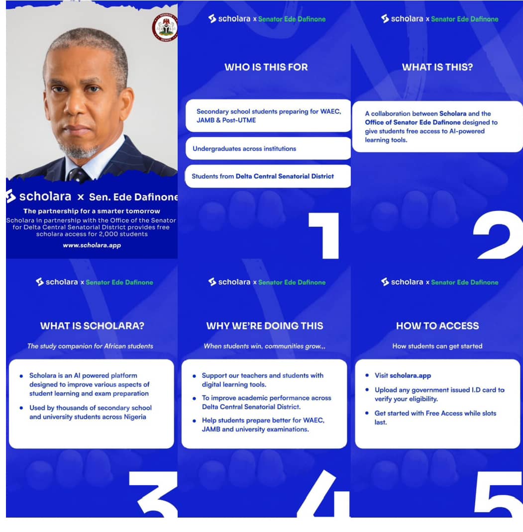 “I am pleased to announce a partnership with Scholara to expand access to AI-powered learning for students across the Delta Central Senatorial District,” Dafinone stated, describing the platform as a tool that enhances how students learn, revise and prepare for examinations.